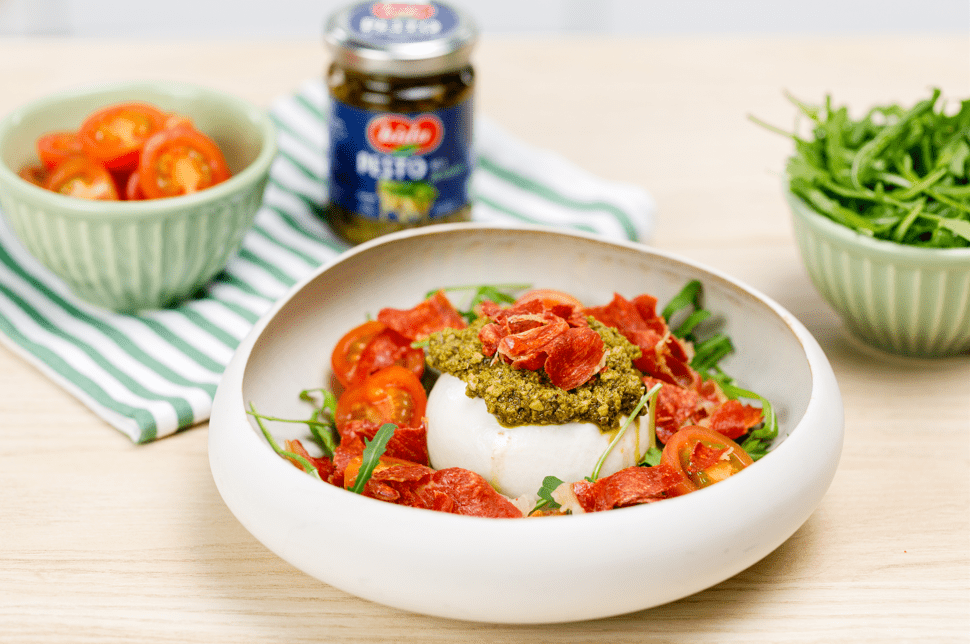Burrata con pesto y crujiente de jamón