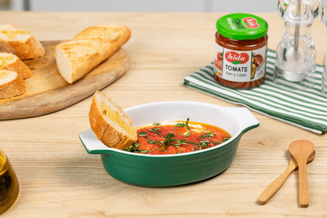 Por otro lado, corta unas rebanadas de pan y añade un chorrito de aceite de oliva para darles un toque más sabroso. Por último, incorpora el pan al tomate.