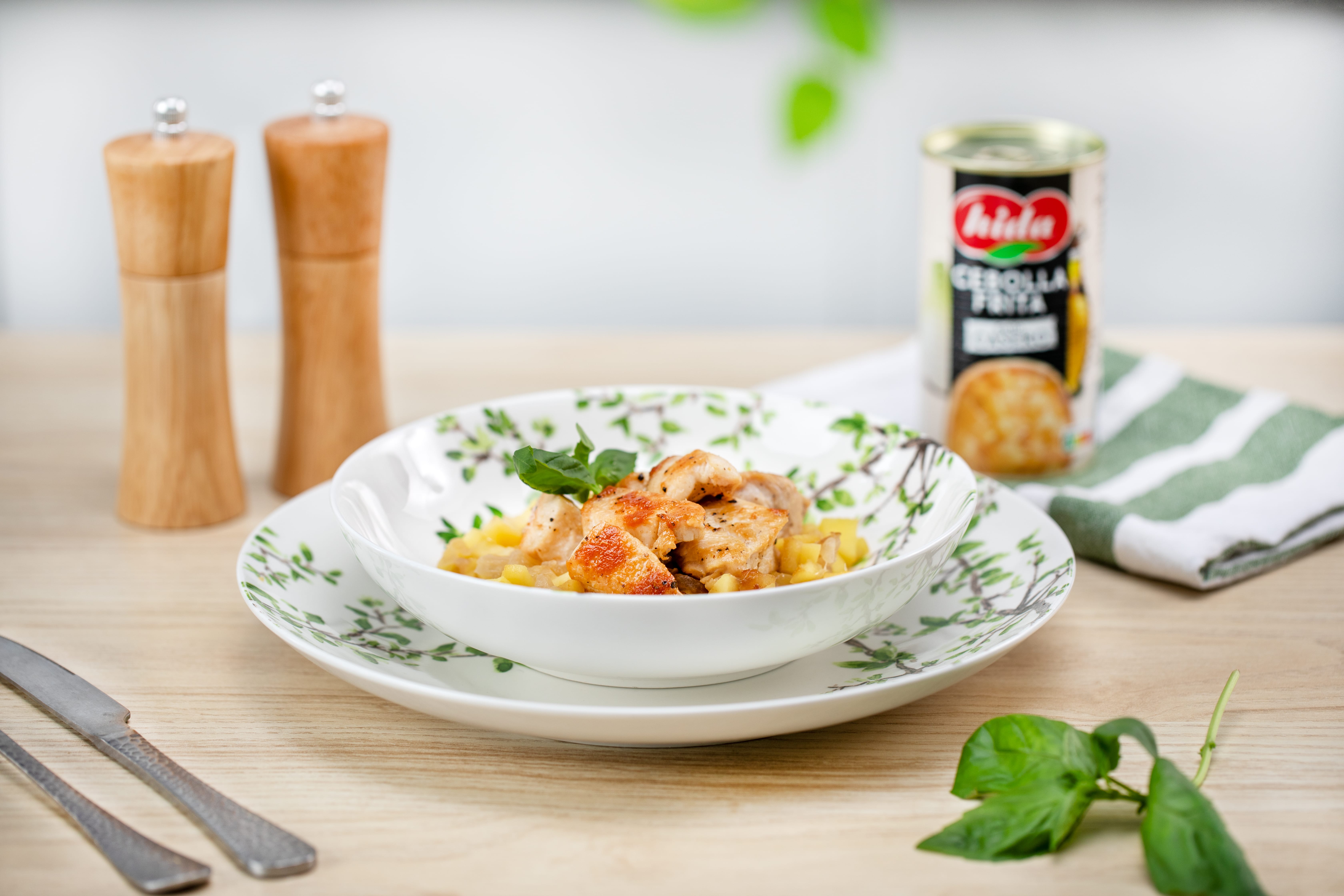 Te va a encantar este delicioso pollo con Cebolla frita Hida, acompañado de la dulzura de la manzana. Un plato fácil de hacer, con sabores irresistibles que combinan perfectamente para una ocasión especial.