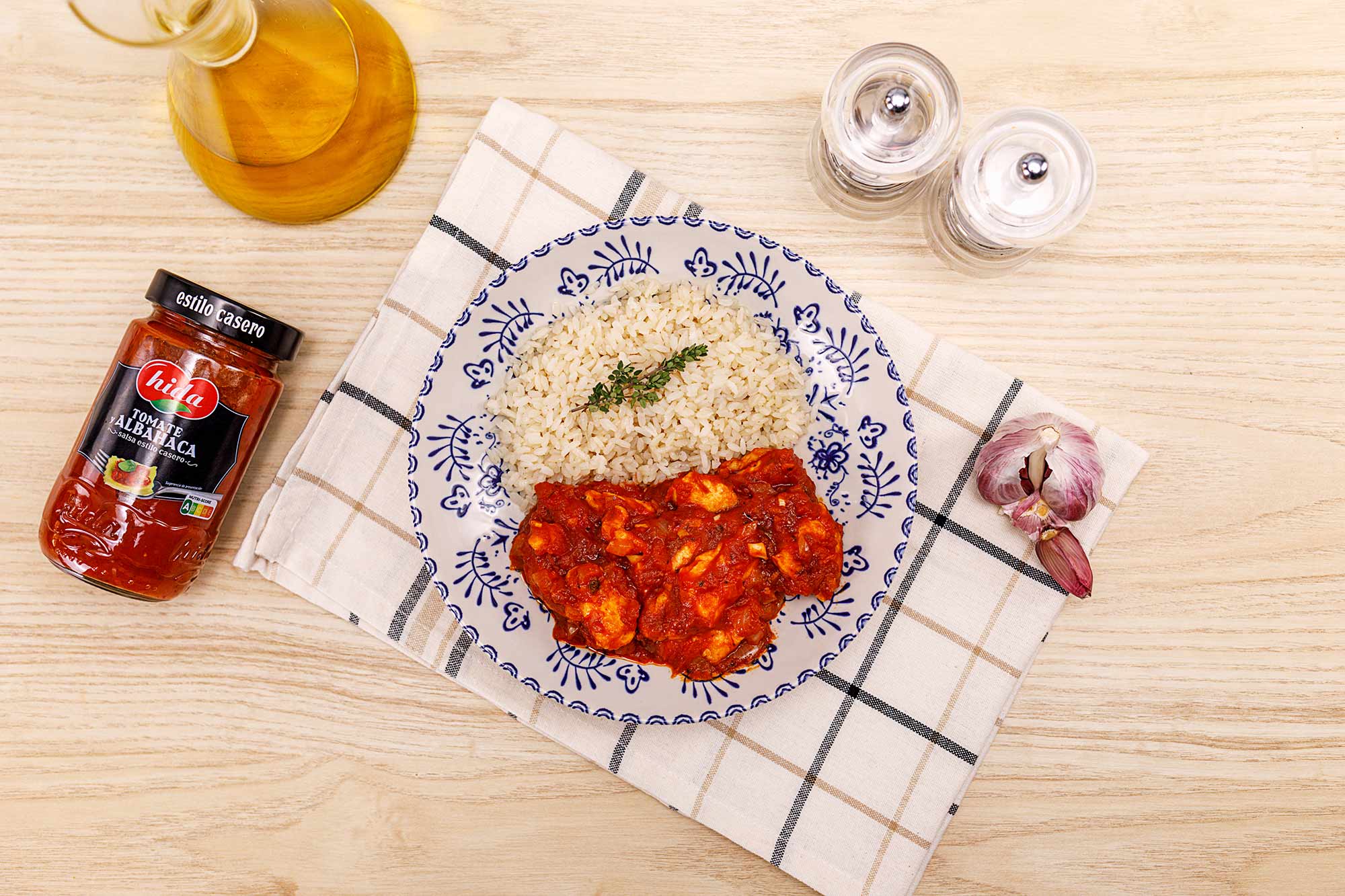 En la misma sartén, saltea el ajo ligeramente. Añade la cebolla picada y deja rehogar a fuego suave hasta que esté blanda. En este punto, agrega la salsa de tomate y albahaca Hida.