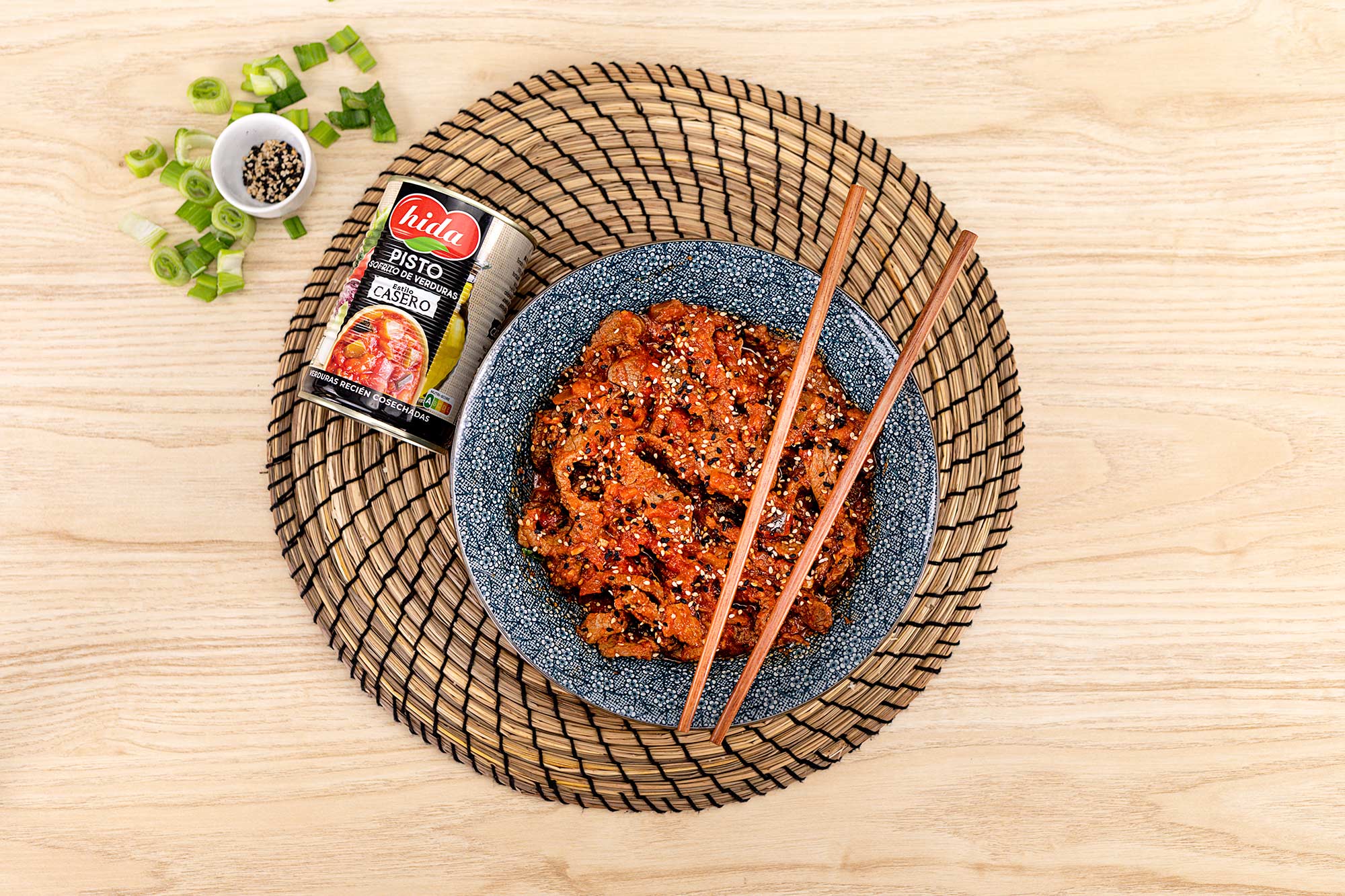 Pasado este tiempo, echa un chorrito de aceite de sésamo en una sartén a fuego fuerte y agrega la mezcla del bol. Saltea la carne hasta que tome color y añade el pisto Hida. Saltea unos minutos más y retira.