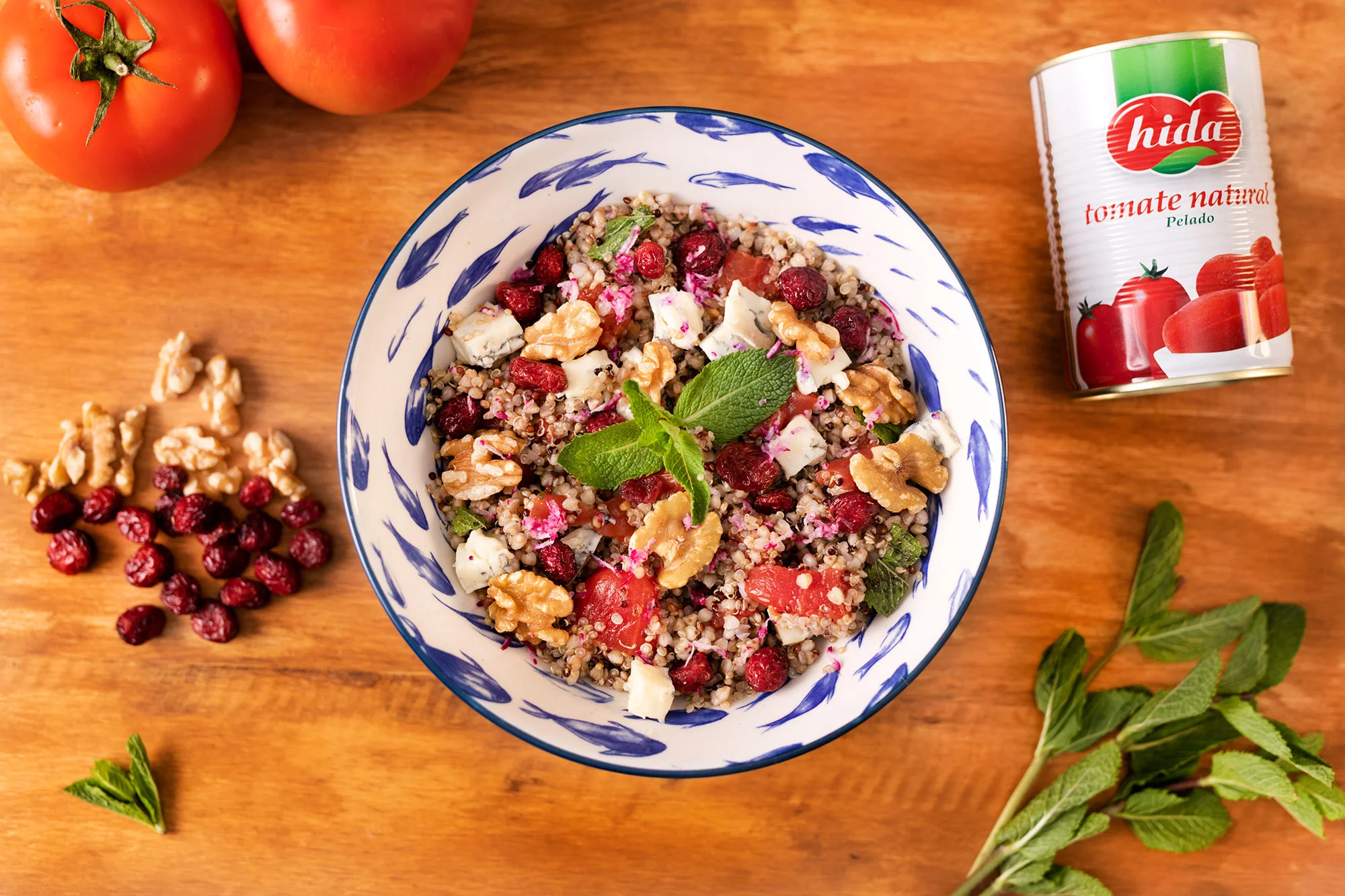 Ensalada de trigo sarraceno y quinoa con tomate natural